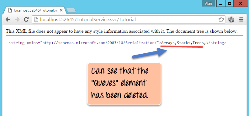 Now, when we browse to the Tutorial URL to show all the strings in our Tutorial list, you will notice that the value of "Queues" is no longer present.