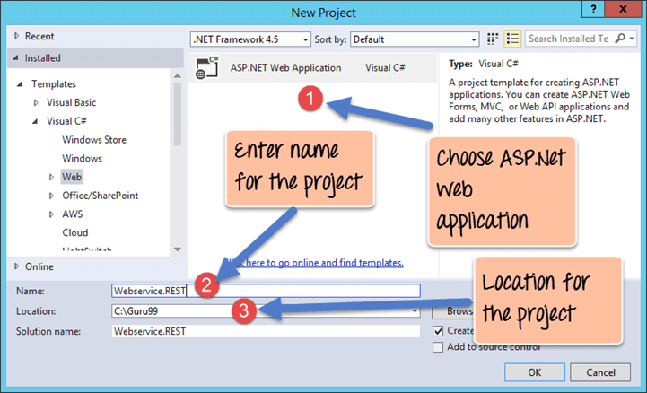 Once you click on the New Project option, Visual Studio will then give you another dialog box for choosing the type of project and to give the necessary details of the project. This is explained in the next step of this RESTful API tutorial