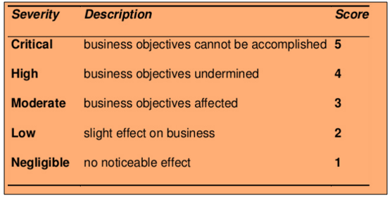 Severity is the degree of impact of damage or loss caused due to the uncertain event. Scored 1 to 4 and can be classified as Catastrophic=1, Critical=2, Marginal=3, Negligible=4