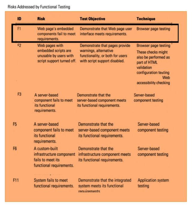 - Test-Browser Page testing is done to execute important user tasks and verify that the R1 ( Risk associated with F1) could be addressed in a range of scenarios.