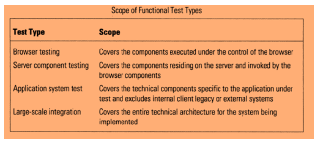 - Functional System Test- Testing of all functionalities, features, programs, modules. The purpose of this test is to evaluate if the system meets its specified requirements.