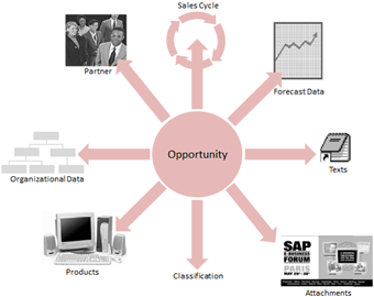 Mainly an opportunity document in SAP CRM contains data related to the Sales cycle, forecast data, classification of opportunity, product data (maintained in Items Assignment Block), and information related to activities, competitor products, sale team, attachments, etc.