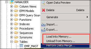 However, the user can load and unload data from individual table manually by selecting a table in SAP HANA studio in respective Schema- by right-clicking and selecting the option "Unload/Load".