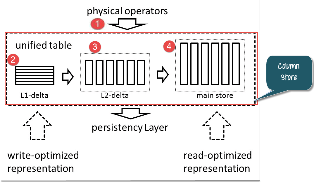 So, Column storage is both Write-optimized and Read-optimized due to L1-Delta and main storage respectively. L1-Delta contains all uncommitted data. Committed data moves to Main Store through L2-Delta. From main store data goes to the persistence layer (The arrow indicating here is a physical operator that send SQL Statement in Column Store). After Processing SQL Statement in Column store, data goes to the persistence layer.