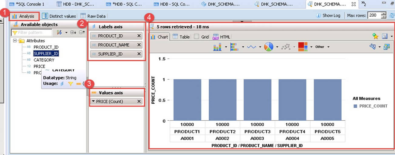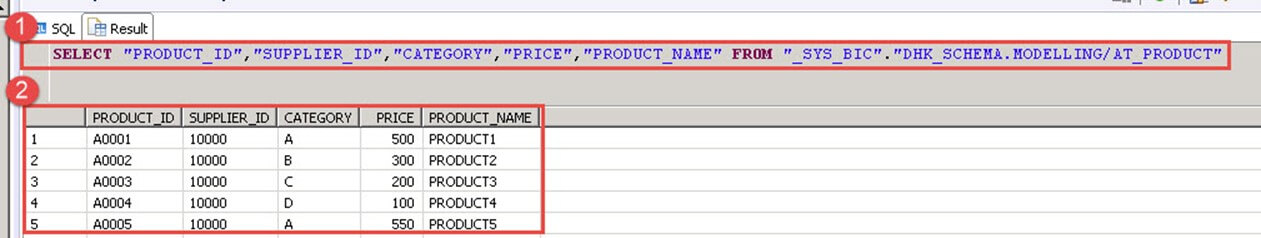 This option display data through SQL Query from the column view under "SYS_BIC" schema. A column view with name "will created after activation of attribute view "AT_PRODUCT". This is used to see SQL query used for displaying data from the view.