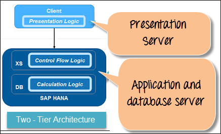 SAP HANA Extended Application Services (SAP HANA XS) is based on 2 –Tier Architecture, in which Application server, Web Server and Development Environment are embedded in a single system.