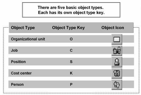 Lets look into the different OBJECT TYPES in detail OM is based upon the use of Object Types and Relationships. Object Types group similar data together. Although an organizational plan can consist of many object types, the five basic building block object types and their 'codes' are as follows: