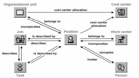 Each aspect of OM is recorded as an object type, a way of grouping similar data together. For example, organizational unit is an object type, position is another object type. Relationships There are many objects within OM, and the creation of relationships is the way that data is linked together. When you build the hierarchical organizational structure, you are creating a relationship between organizational unit objects. If you attach a position to an organizational unit, you are creating a relationship between the position object and the organizational unit object. Validity Dates