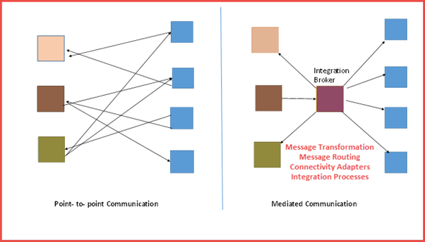 Prior to SAP PI, business would connect with each other through point-to-point communication. But this process is not used for multiple and complex processes. For smooth communication between multiple businesses, Mediated communication or Integration broker is used, and SAP PI adapts this system very well. It enables interconnection of a different process via a central location known as Integration Broker, unlike the point to point connection which is more like a spider web. The integration broker or server is an integral part of mediated communication consist of Java based Advanced Adapter Engine (AAE) and an integration engine for routing. Mediated communication is based on an integration broker which is executed by exchanging XML messages.