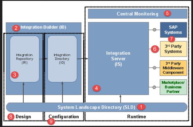 SAP PI is not a single component responsible for the integration of SAP and Non- SAP application, but it is a cluster of components that together make SAP PI functional. This architecture of SAP PI or components is used during design time, configuration time and at run time. The various components of SAP PI include