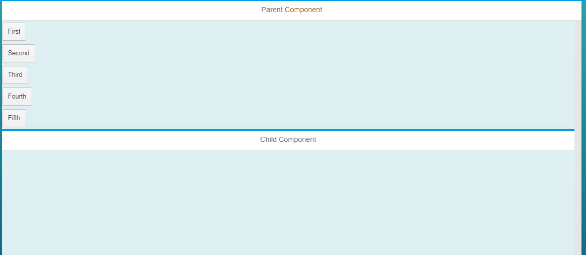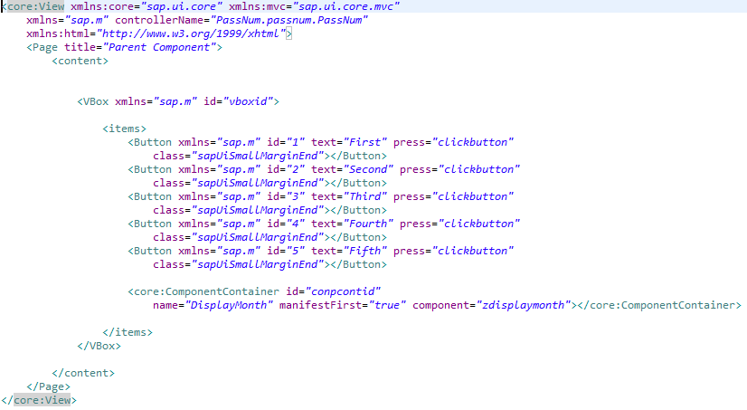 <Page title="Parent Component"> <content> <VBox xmlns="sap.m" id="vboxid"> <items> <Button xmlns="sap.m" id="1" text="First" press="clickbutton" class="sapUiSmallMarginEnd"></Button> <Button xmlns="sap.m" id="2" text="Second" press="clickbutton" class="sapUiSmallMarginEnd"></Button> <Button xmlns="sap.m" id="3" text="Third" press="clickbutton" class="sapUiSmallMarginEnd"></Button> <Button xmlns="sap.m" id="4" text="Fourth" press="clickbutton" class="sapUiSmallMarginEnd"></Button> <Button xmlns="sap.m" id="5" text="Fifth" press="clickbutton" class="sapUiSmallMarginEnd"></Button> <core:ComponentContainer id="conpcontid" name="DisplayMonth" manifestFirst="true" component="zdisplaymonth"></core:ComponentContainer> </items> </VBox> </content> </Page>