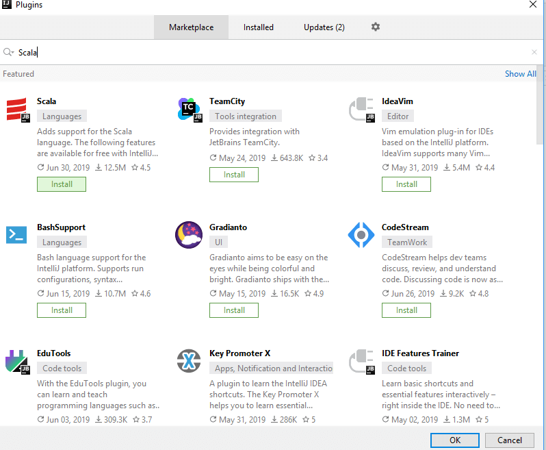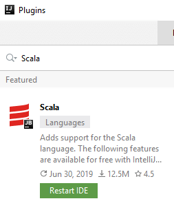 On the Marketplace tab, a search for Scala will present the plugin as the first result under the Languages tag.