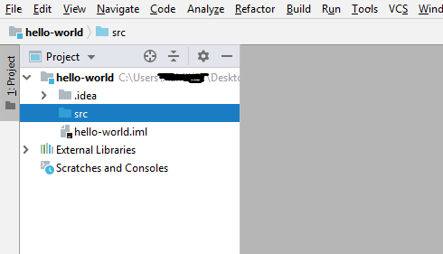 At the moment the project is empty and only contains a .idea folder and hello-world.iml file generated by the IDE. Our point of interest is the src folder. Src is where we store the source code for our project. It's where we'll create our first Scala file.