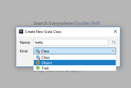 We will then create a name for the file, in this Scala tutorial we'll use hello and then choose from a dropdown what to put as the content of the Scala file. Select "Object"