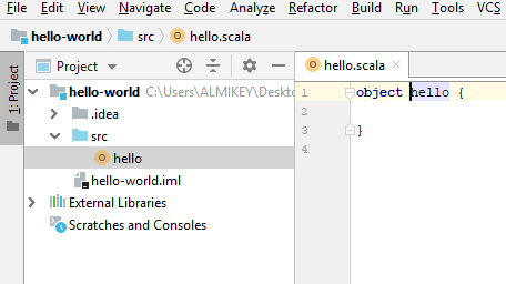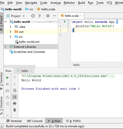 Now that you have a Scala file with a Hello object. You will write your first program by extending the object you have created using the App keyword.