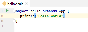 Inside the Hello object, we write one function println() which is used to print the text inside it to the console. We will run our code by clicking on the green arrow.