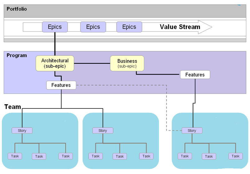 At the program level, features can be originated, or they can derive from epics defined at the portfolio level.