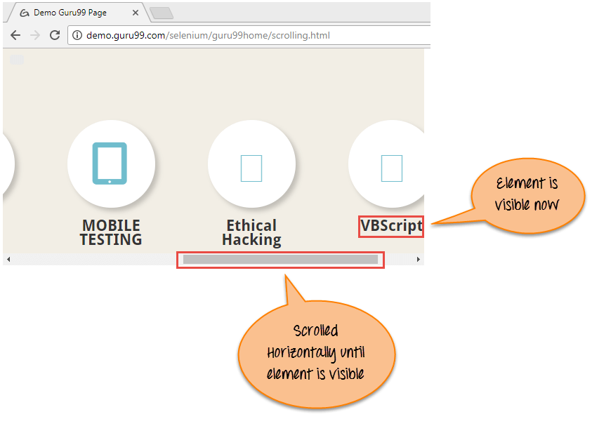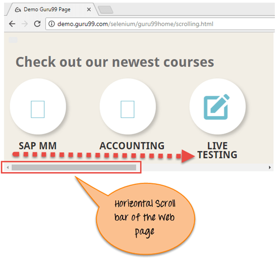 Script Description : In the above code, we first launch the given url in Chrome browser. Next, scroll the page horizontally until the mentioned element is visible on the current page. Javascript method scrollIntoView() scrolls the page until the mentioned element is in full view :