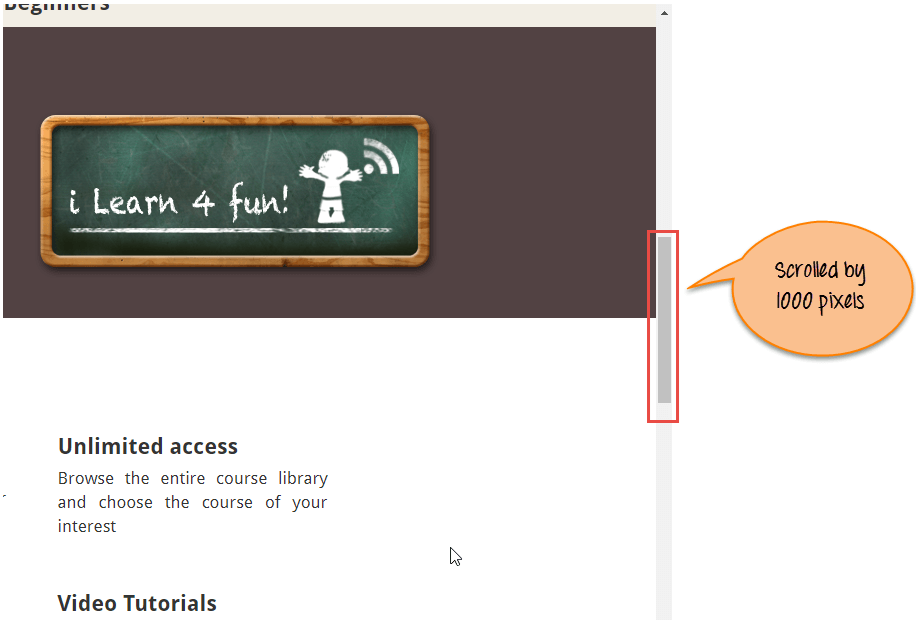 js.executeScript("window.scrollBy(0,1000)"); //Scroll vertically down by 1000 pixels Output analysis : Here is the output when you execute the above script .