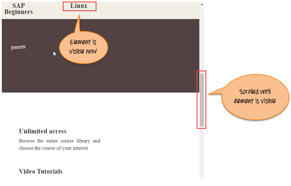 js.executeScript("arguments[0].scrollIntoView();",Element );Output analysis: Here is the output when you execute the above script.