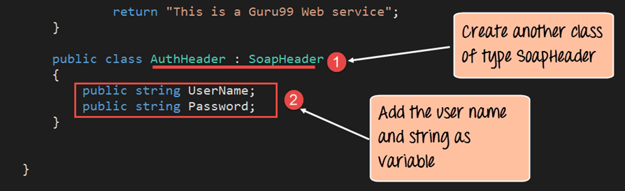 Step 4) Add the following code to your Tutorial Service asmx file. The below snippet of code is used to add a custom class which will be used to change the SOAP Header when the SOAP message is generated. Since we now want to add security credentials to the SOAP header, this step is required.