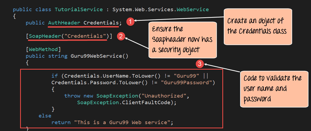 Step 5) As the next step, the following code needs to be added to the same TutorialService.asmx file. This code actually defines the function of our web service. This function returns a string "This is a gtupapers Web service" to the client. But this time, the string will only be returned if the client application passes the credentials to the web service.