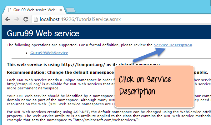The above output is shown when the program is run, which means that the Web service is now available. Let's click on the Service Description link.