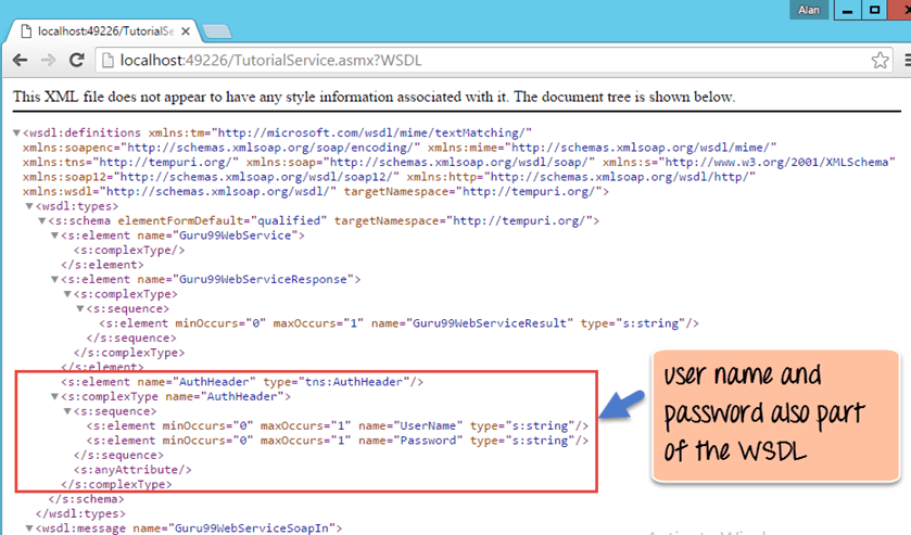 The below snippet shows the format of the authentication part which is part of the WSDL document. Now based on the below snippet, the SOAP message will contain 2 additional elements, one being the Username and the other being the Password.