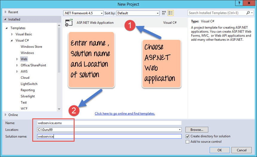 Once you click on the New Project option, Visual Studio will then give you another dialog box for choosing the type of project and to give the necessary details of the project. This is explained in the next step