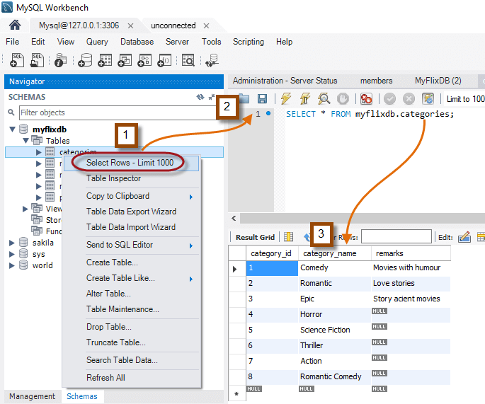 1. Right Click on the Categories Table. Click on "Select Rows - Limit 1000"
