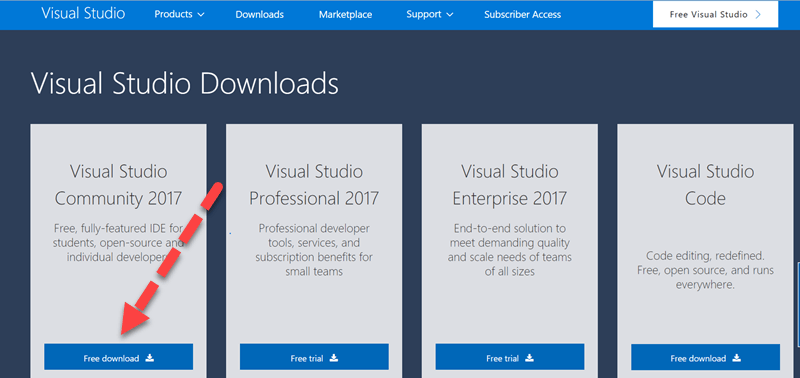 Step 1) Navigate to the URL https://visualstudio.microsoft.com/downloads/ and Click on the 'Free download' button displayed on Visual Studio Community 2017 tab