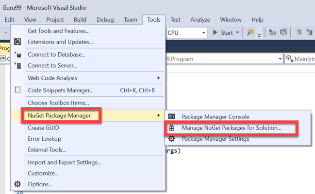Step 1) Navigate to Tools -> NuGet Package Manager -> Manage NuGet Packages for Solution