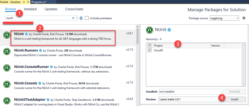 We need to install NUnit Framework and NUnit Test Adapter onto Visual Studio inorder to use it.