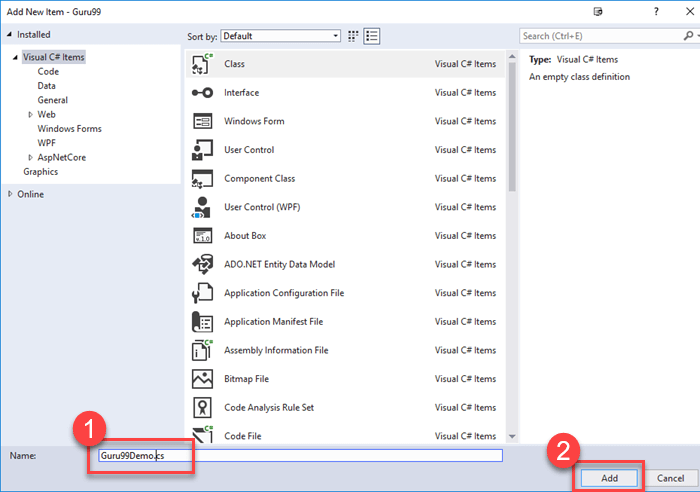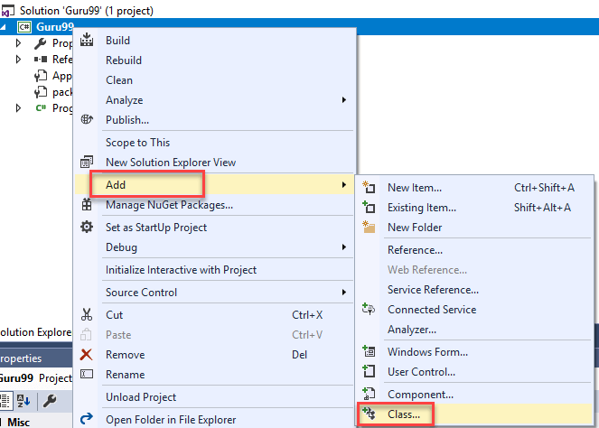 Step 1) In the Solution Explorer, Right click on project > Add > Class