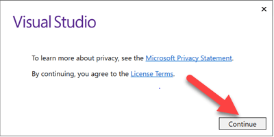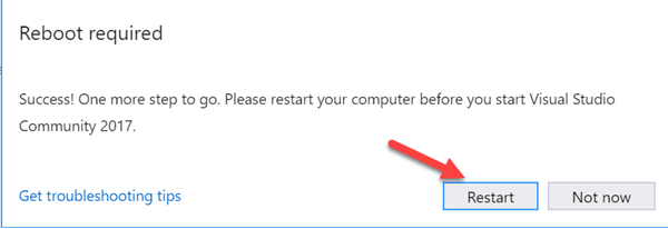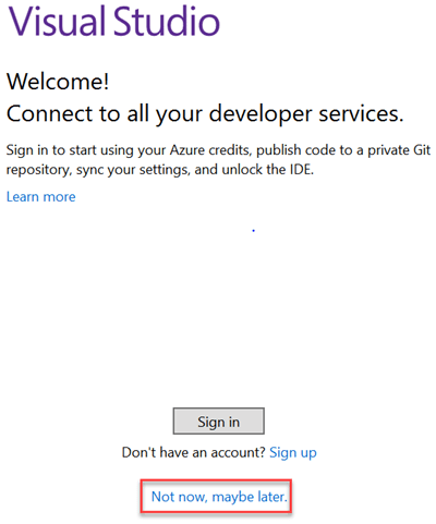 Step 6) Once the machine is restarted, search for "Visual Studio 2017" on the start menu and click on the search result. The following popup will appear. Click on "Not now, maybe later" link if you do not have an existing account.