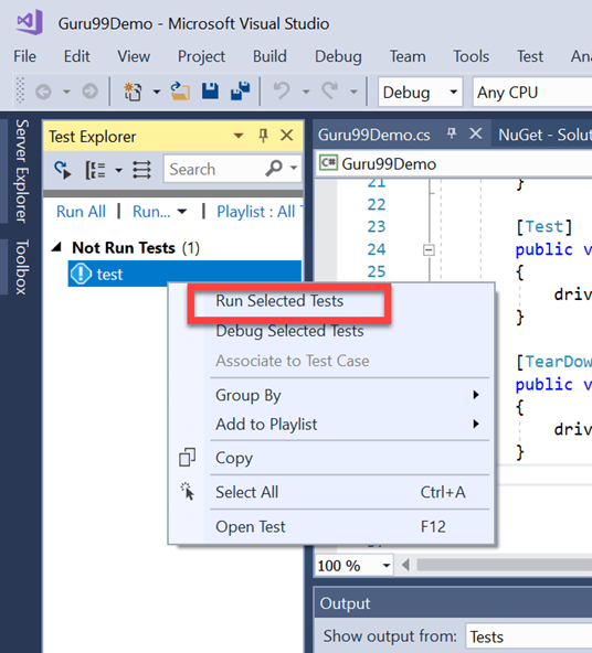Step 6) Test Explorer window opens with the list of available tests. Right-click on Test Explorer and select Run Selected Tests