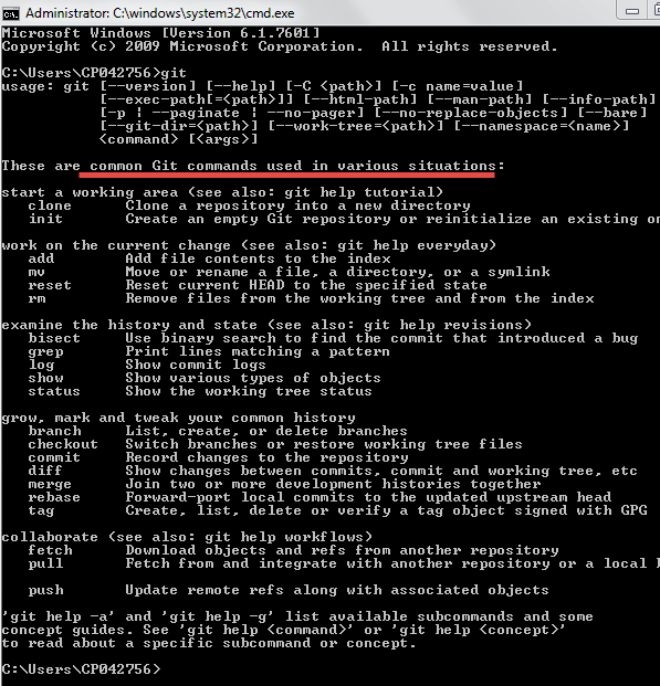 Open Command prompt and type "git" and hit "Enter" If you see below screen means it is installed successfully