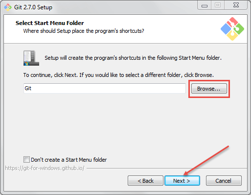 Step 10) If you want to create a start menu folder for Git, leave the setting default and click on next.