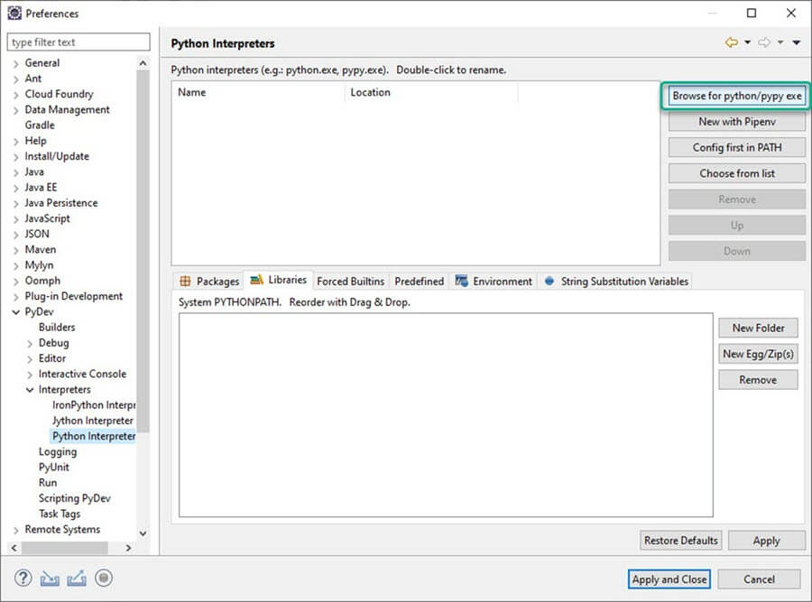 Go to Window > Preferences > PyDev > Interpreter > Python Interpreter.