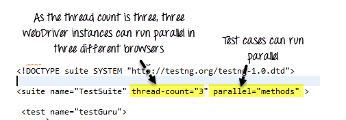 <?xml version="1.0" encoding="UTF-8"?> <!DOCTYPE suite SYSTEM "http://testng.org/testng-1.0.dtd"> <suite name="TestSuite" thread-count="3" parallel="methods" > <test name="testGuru"> <classes> <class name="TestgtupapersMultipleSession"> </class> </classes> </test> </suite>