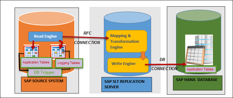SAP SLT server uses a trigger-based replication approach to pass data from source system to target system.