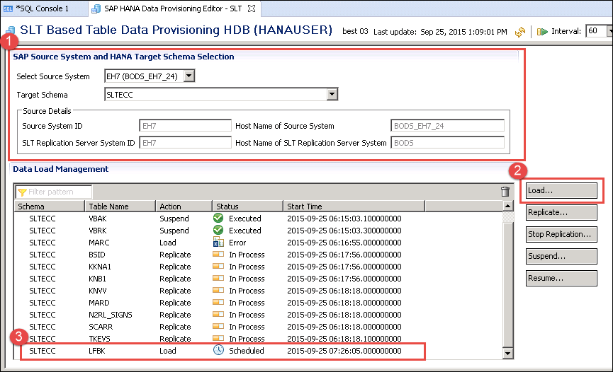 We use the first option from the table "Load option" for initial load of the table (LFBK) data from source to SAP HANA table.