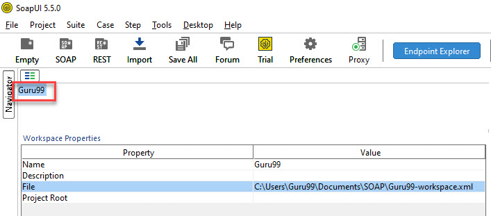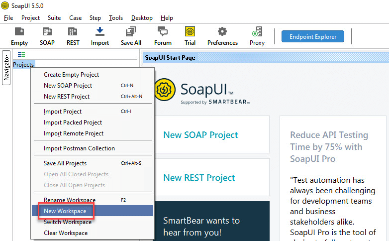 - First step in SOAP UI is to create a workspace. There can be several projects associated with a workspace. Users can create more than one workspace. In SOAP UI Pro version, we can seamlessly switch environments to map it to different end points.