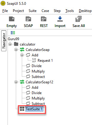 Step 3: The created test suite is displayed the navigator pane as shown below.