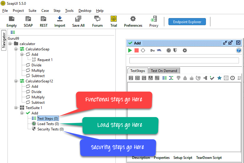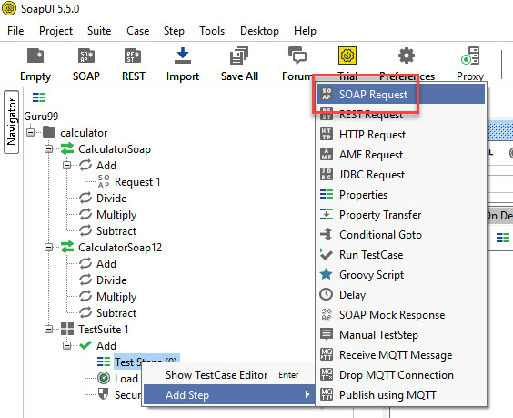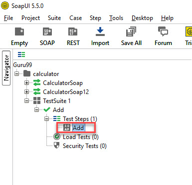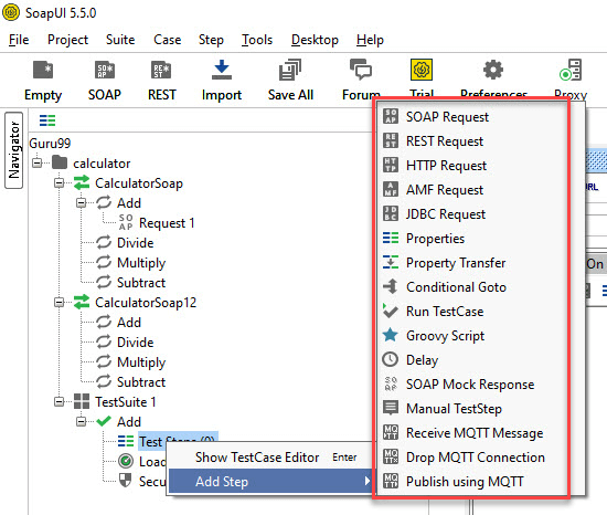Step 4: We can insert a variety of test steps by performing a right-click on test steps and selecting an appropriate test step as shown below. So, if you were to test a REST Webservice, you would select the REST Test Request.