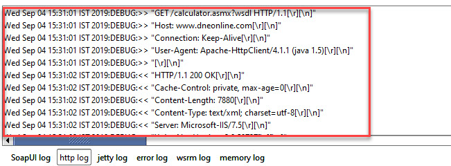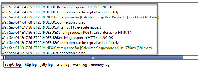 SoapUI Log – Displays the response information from the webserver. The same information is stored in soapui.log file of the SOAP-UI installed folder under 'bin' directory.