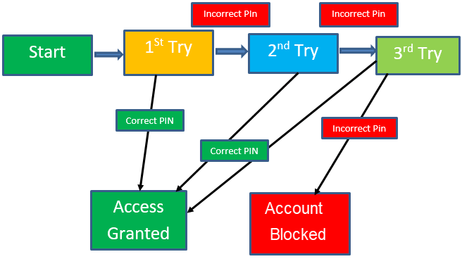 In the above-given table when the user enters the correct PIN, the state is transitioned to Access granted. And if the user enters an incorrect password, he or she is moved to next state. If he does the same 3rd time, he will reach the account blocked state.