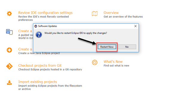 Step 14) Click on "Restart Now" button to restart Eclipse IDE and apply the changes.