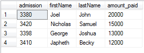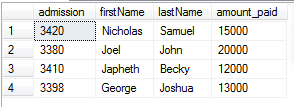 SELECT Students.admission, Students.firstName, Students.lastName, Fee.amount_paid FROM Students INNER JOIN Fee ON Students.admission = Fee.admission
