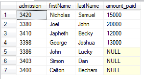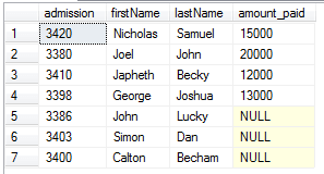 SELECT Students.admission, Students.firstName, Students.lastName, Fee.amount_paid FROM Students FULL OUTER JOIN Fee ON Students.admission = Fee.admission